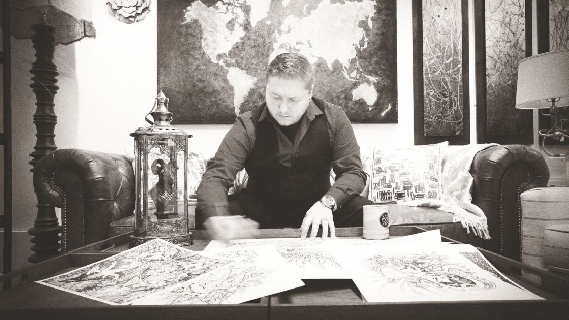 While Aleks is equally hilarious in person, he’s also one of the most dedicated artists I’ve met. The amount of time, commitment, and detail he puts into every piece boggles my mind. Aleks’ work is nothing short of genius, and I don’t throw that term around loosely. Call me dense but I can’t imagine how someone does that with their hand and a pen. Kaleidoscopes of floral petals arranged with mathematical precision, adorned by intricately penned skulls. He has an amazing series on his interpretation of the zodiac. His work often has a medieval feel to it, drawing inspiration from his Russian roots; a blend of paganism and eastern orthodox Christianity. Among his influences, 16th century artist Albert Durer and Russian artist/designer Art Lebedev.